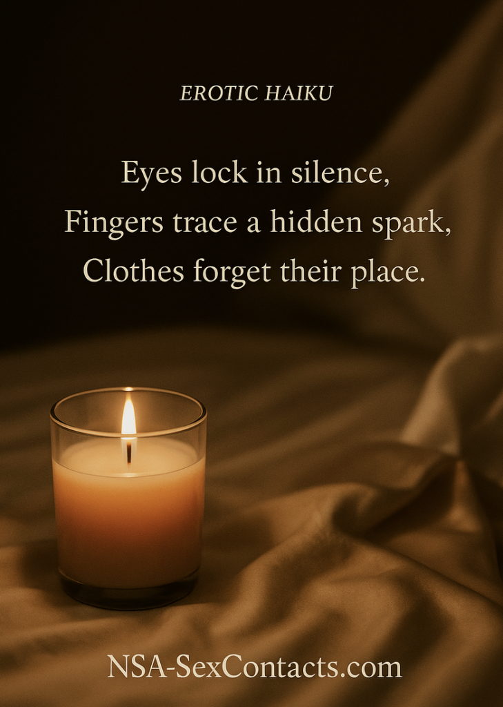 Erotic Haiku Eyes lock in silence. Fingers trace a hidden spark. Clothes forget their place. a473 10th October 2025 Leave a Comment on Erotic Haiku Eyes lock in silence. Fingers trace a hidden spark. Clothes forget their place. Posted in EroticHaiku, RealDesire Share: TwitterFacebookPinterestLinkedin Ready for more moments like that?đŸ‘‰ NSA Sex Contacts NSADating NoStringsAttached SexyPoetry Author: a473